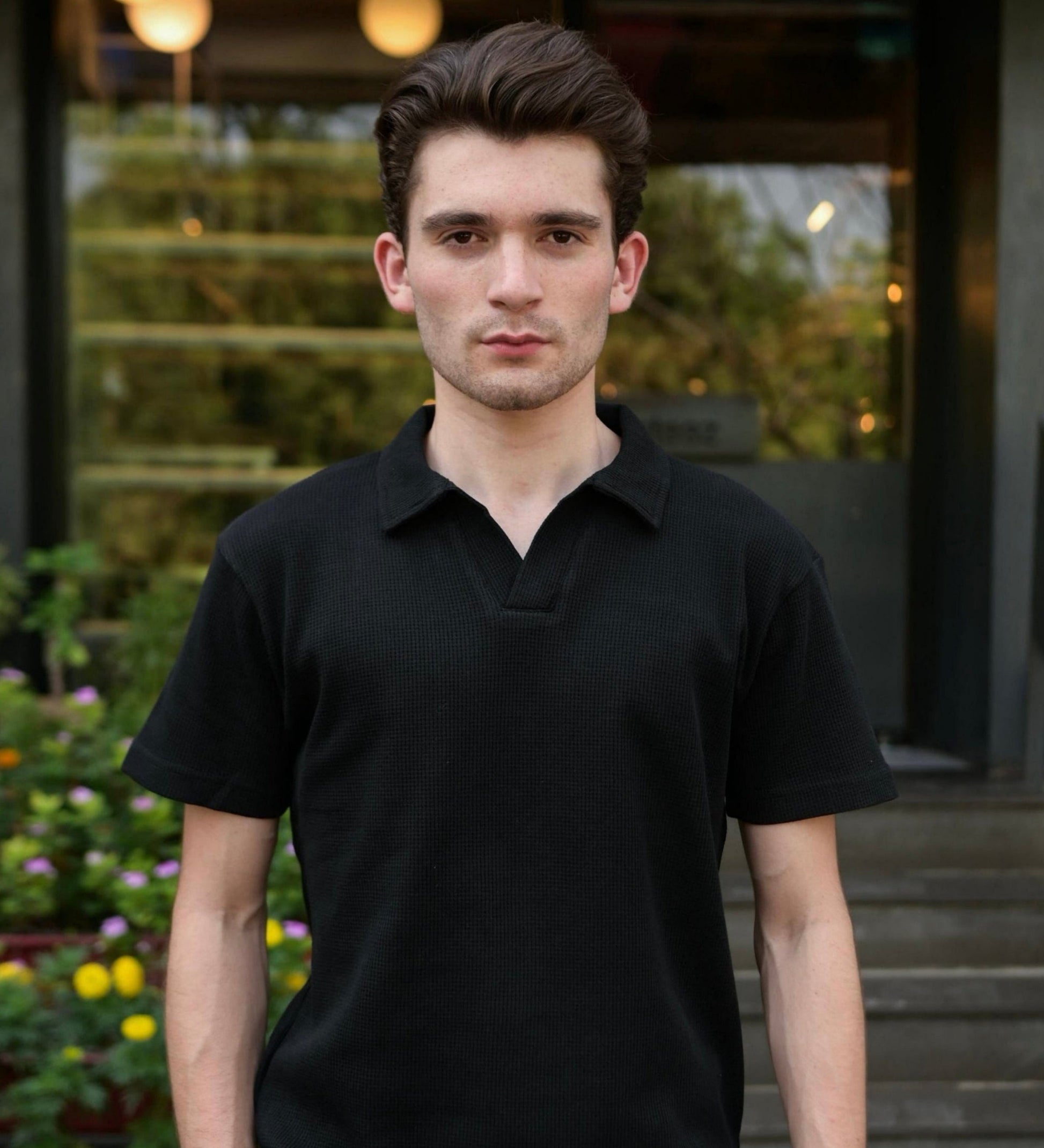 Waffle knitting is characterized by its distinctive raised pattern, which not only enhances the shirt’s aesthetic appeal but also provides added warmth without bulk. This feature makes the black waffle knitted polo ideal for transitional seasons when temperatures fluctuate. Pair it with a light jacket or wear it on its own; it’s incredibly easy to style. The timeless black color ensures that it fits perfectly into any existing wardrobe, allowing for endless mix-and-match possibilities.